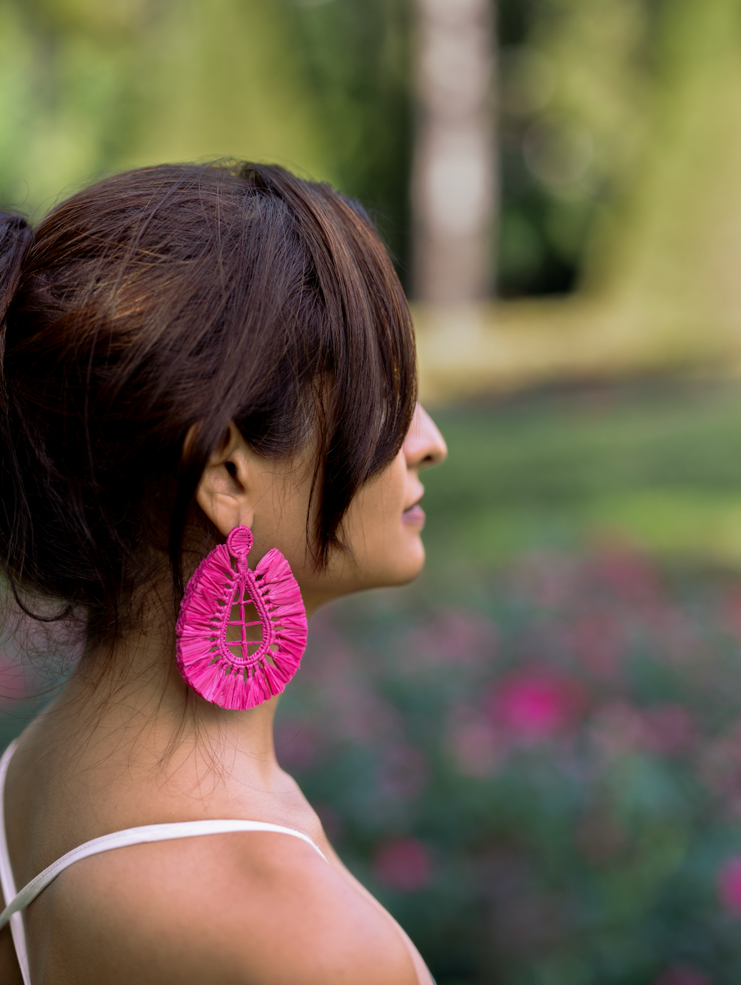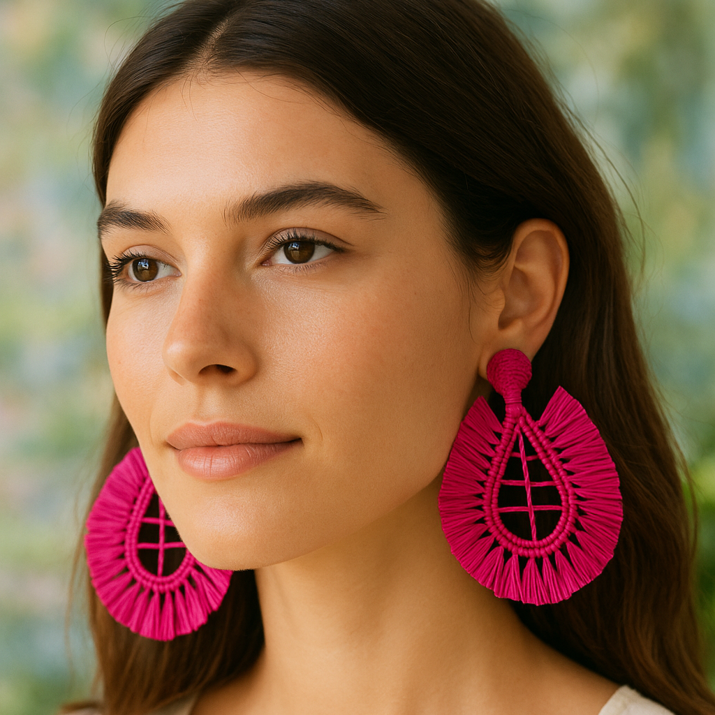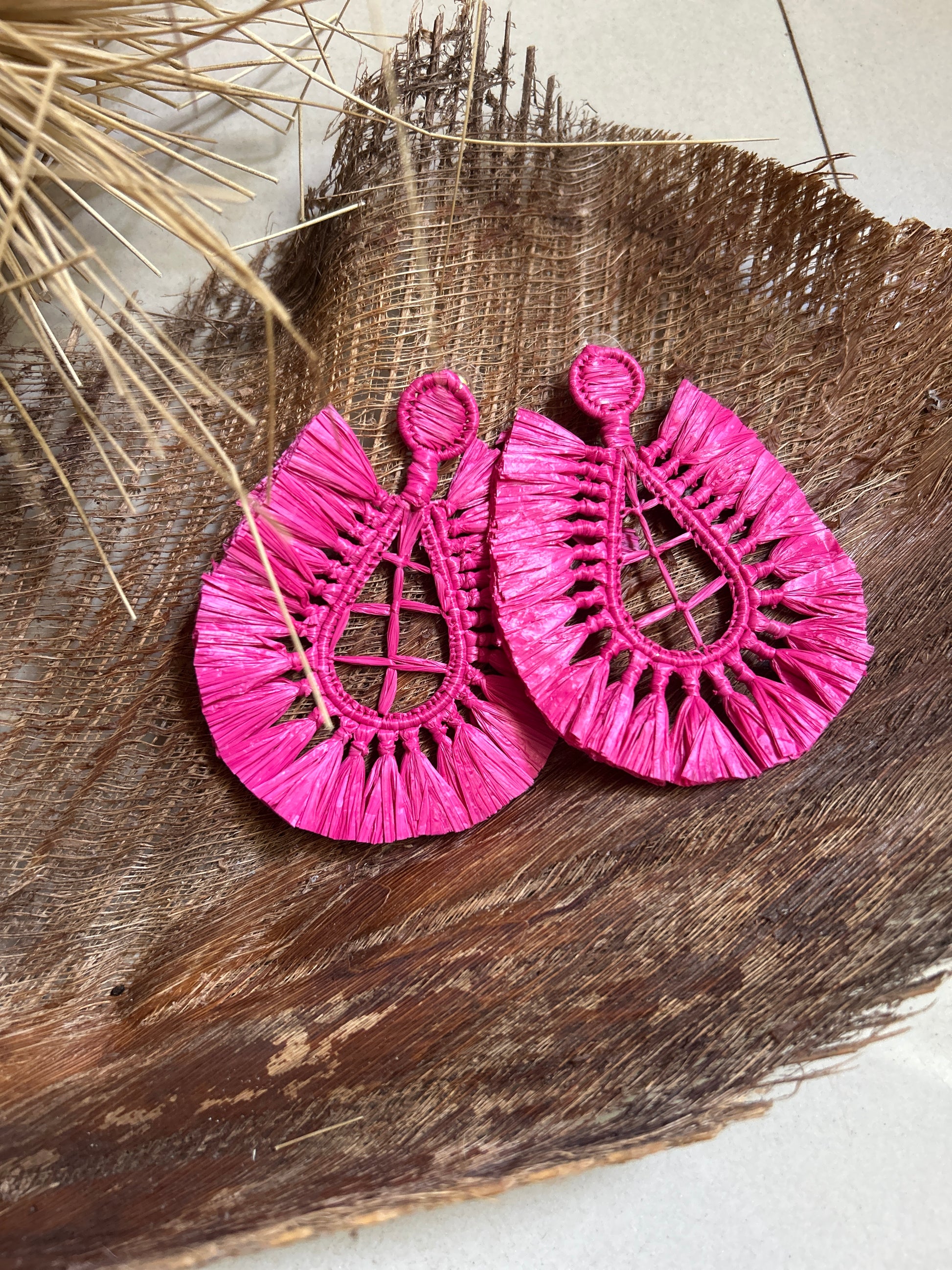 Inspired by the vivid blooms in Monet's Giverny garden, these vibrant hot pink statement earrings embody bold femininity with a playful twist. Handwoven from natural palm leaves, each piece showcases intricate craftsmanship that mirrors the garden’s lush textures and vibrant tones. Lightweight and sustainable, these earrings add a splash of colour to any look, blending Caphira’s dedication to eco-conscious design with a vivid, artful aesthetic.