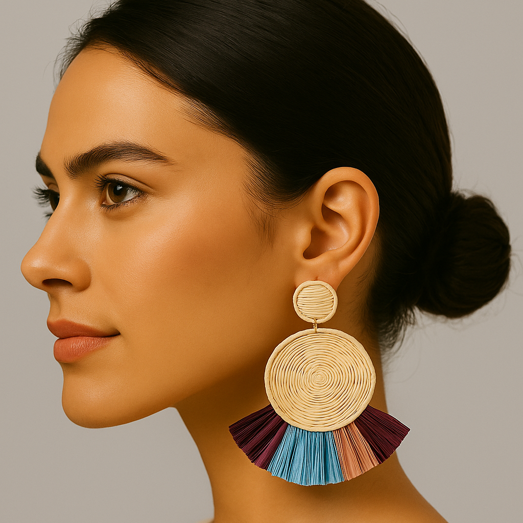 Drawing inspiration from the vibrant, layered colors of Monet's Giverny garden, these statement earrings capture the essence of blooming florals in every hue. Featuring a beige dried palm leaf center, this piece is brought to life by elegant extensions in soft blue, rich purple, and blush pink cascading from the bottom half. Lightweight and unique, these earrings embody Caphira’s love for natural beauty and sustainable luxury, perfect for those who embrace colourful, art-inspired style.