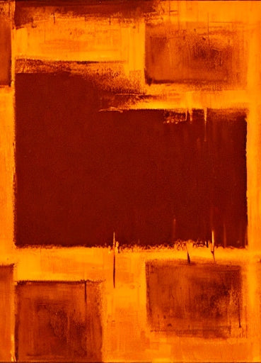 Capturing the final whisper of sunset before nightfall. Abstract brushstrokes in burnt orange, amber, and ash-gray swirl like smoke around a hidden sun—radiant yet veiled.