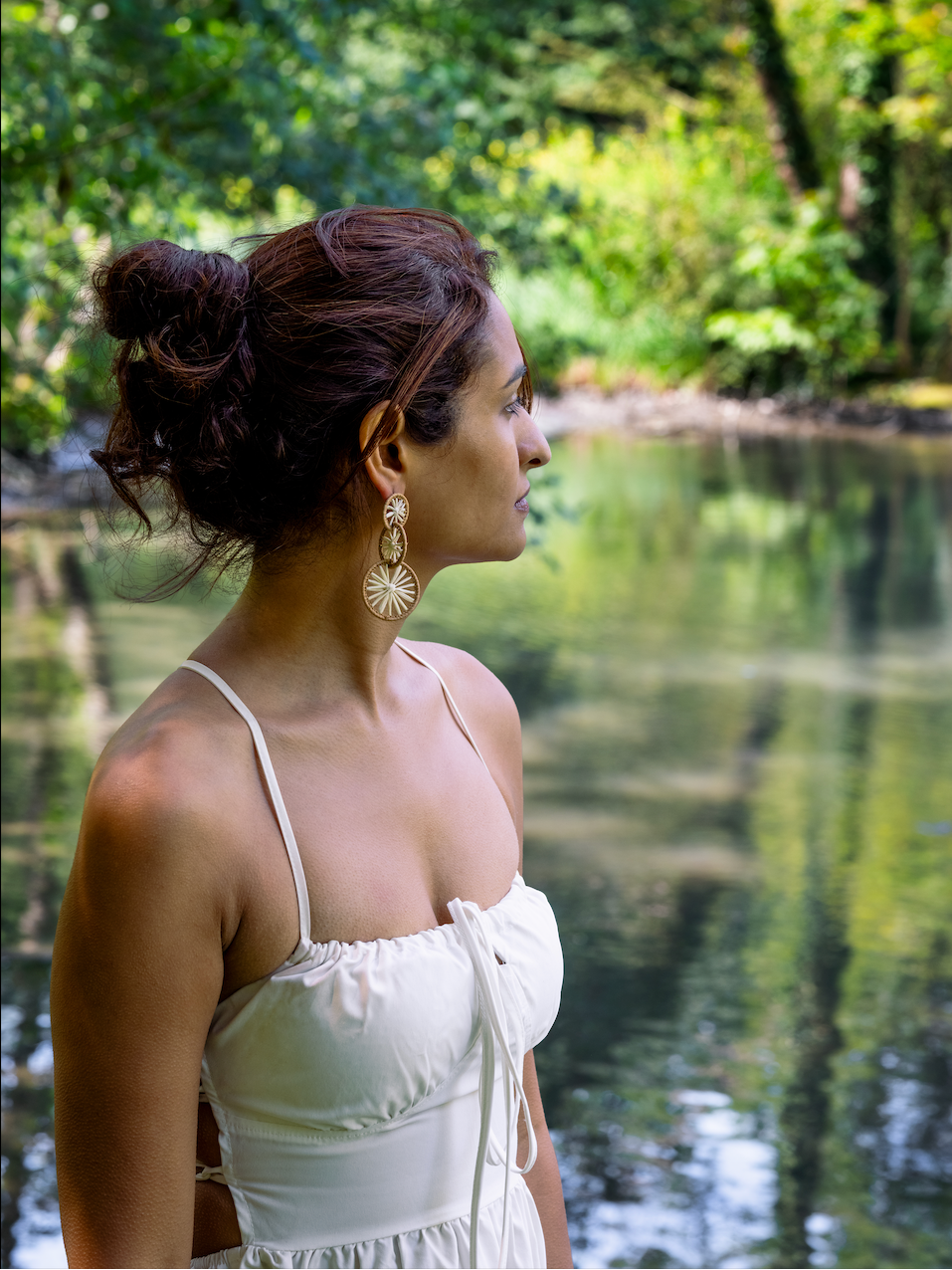 Inspired by the lush, layered beauty of Monet’s garden in Giverny, these statement earrings are a fusion of elegance and artistry. Crafted from natural white palm leaves, the design features three intricately entwined circular forms, echoing the gentle flow of nature. Lightweight yet impactful, these earrings make a bold statement while staying true to Caphira’s commitment to plant-based, sustainable materials.